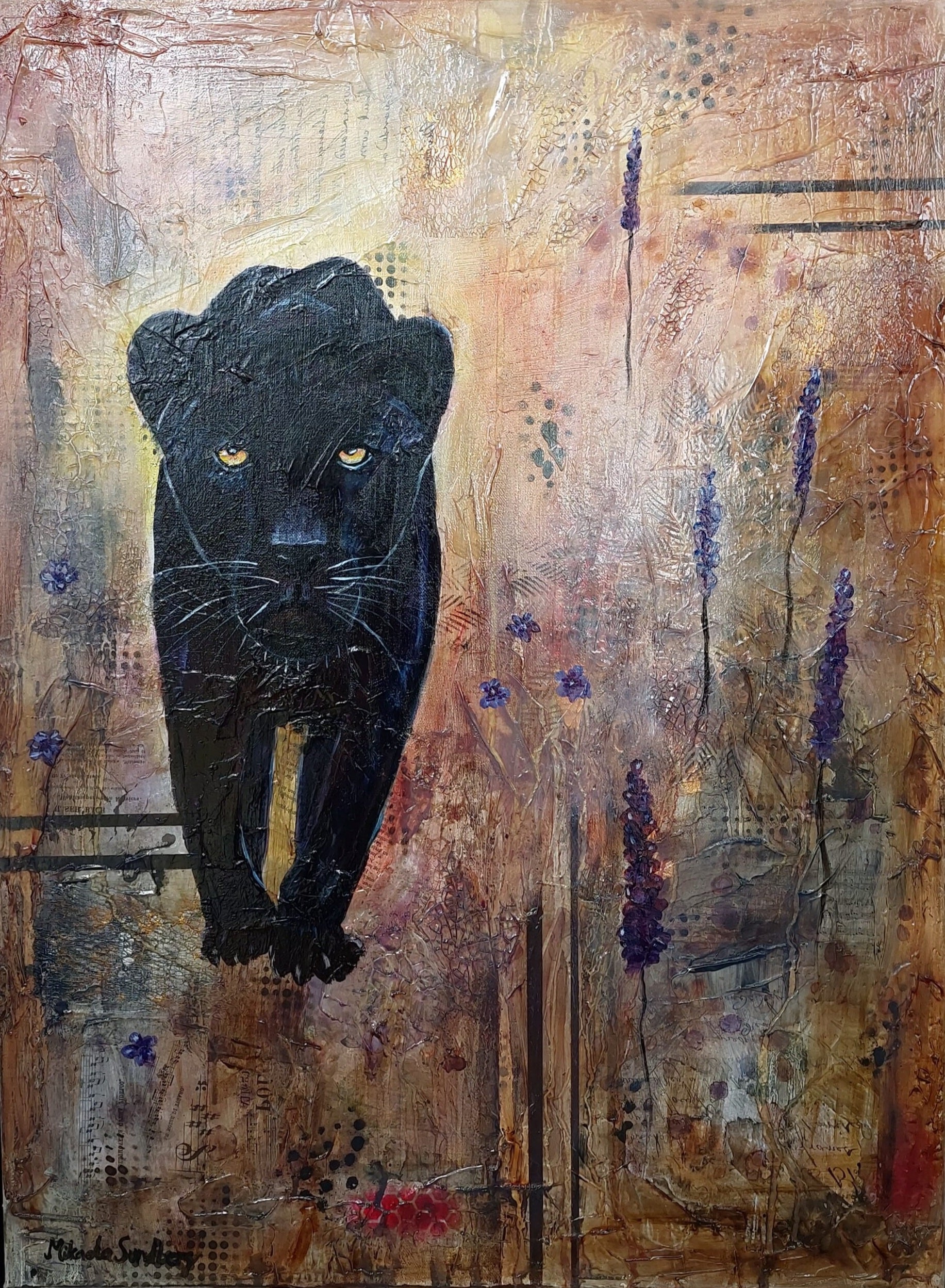 En mixmedia målning i olja. 60x80 x2.5 cm svart svävarram runt om.