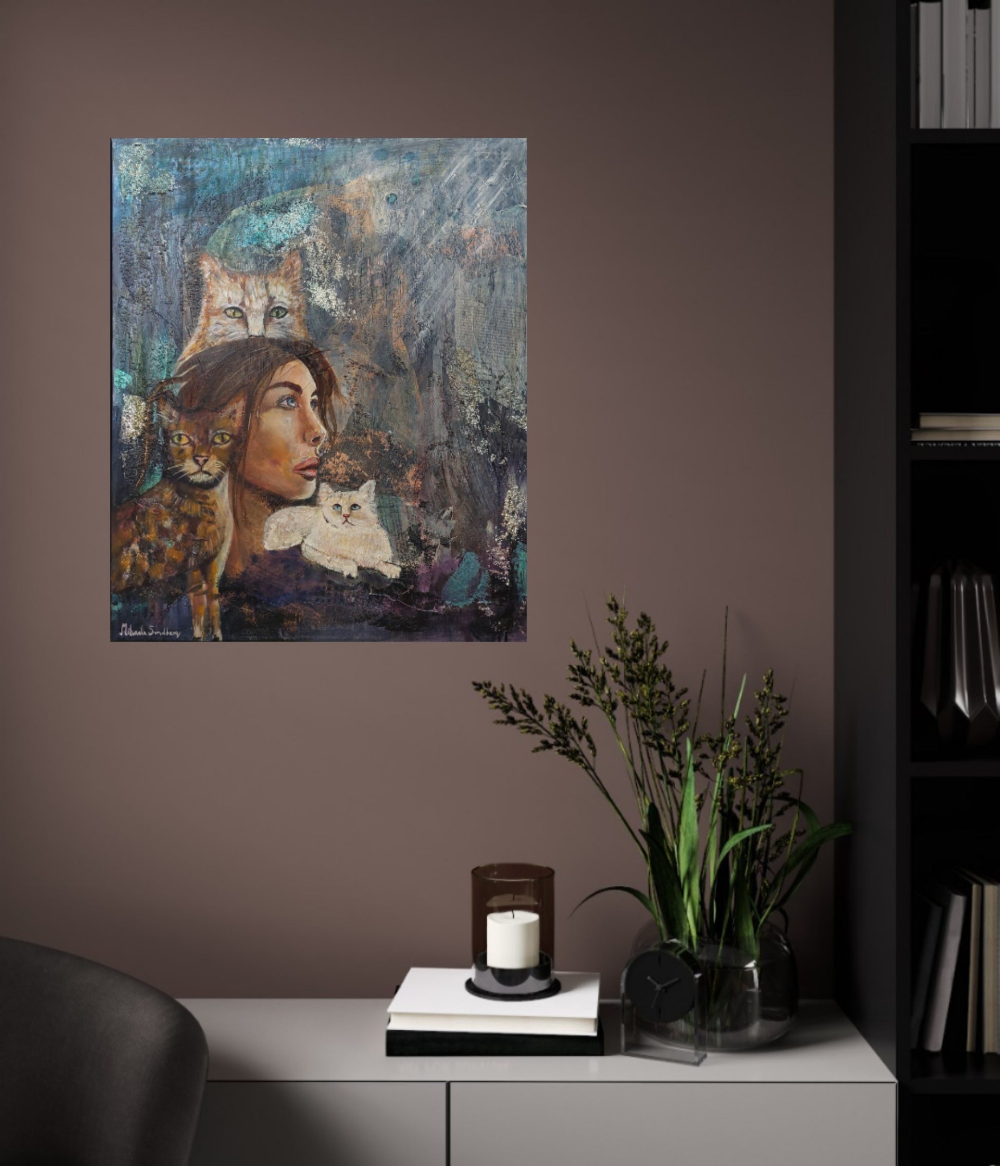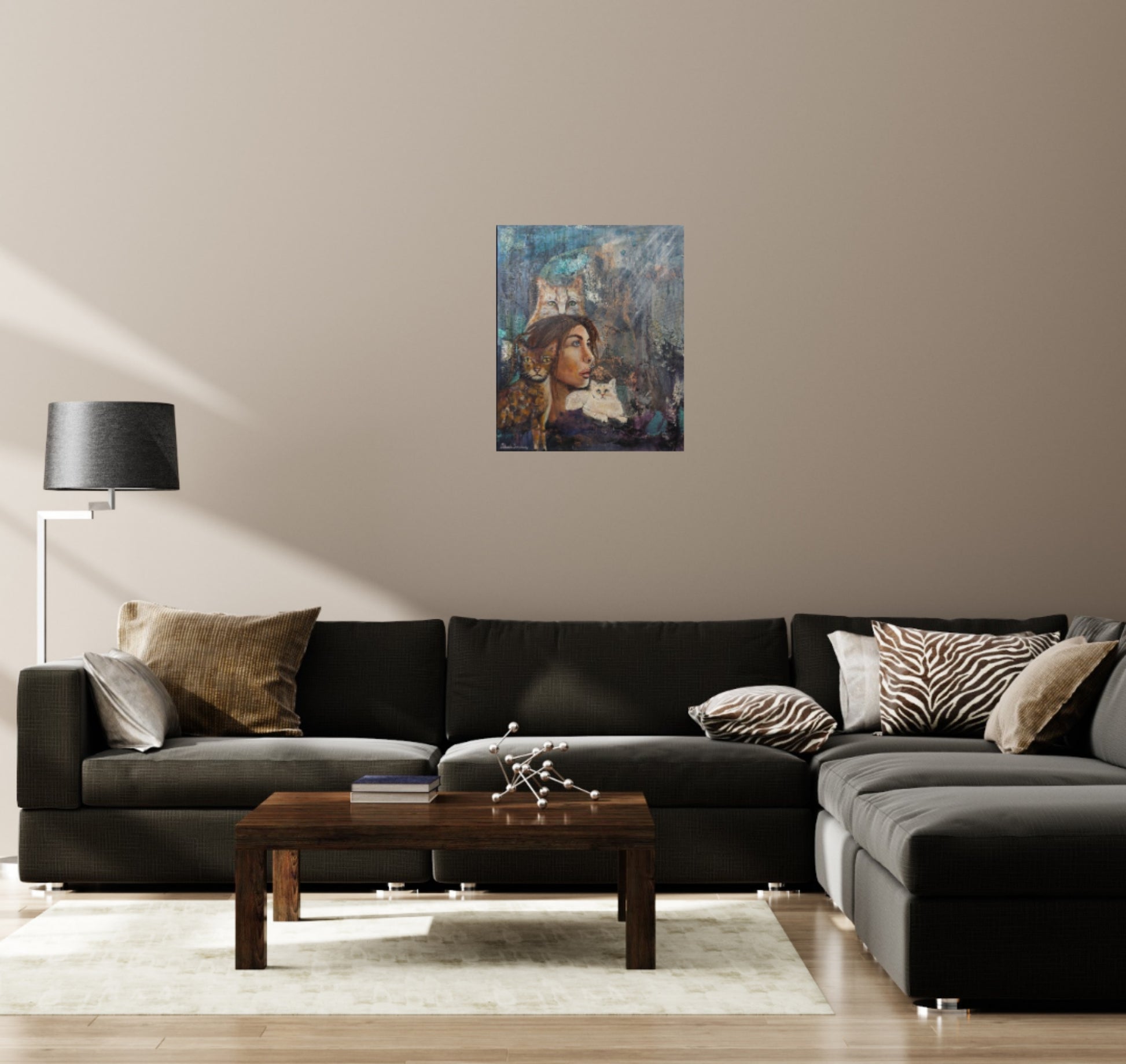 En mixmedia målning i olja. 50x60x2,5 cm svävarram runt i svart.