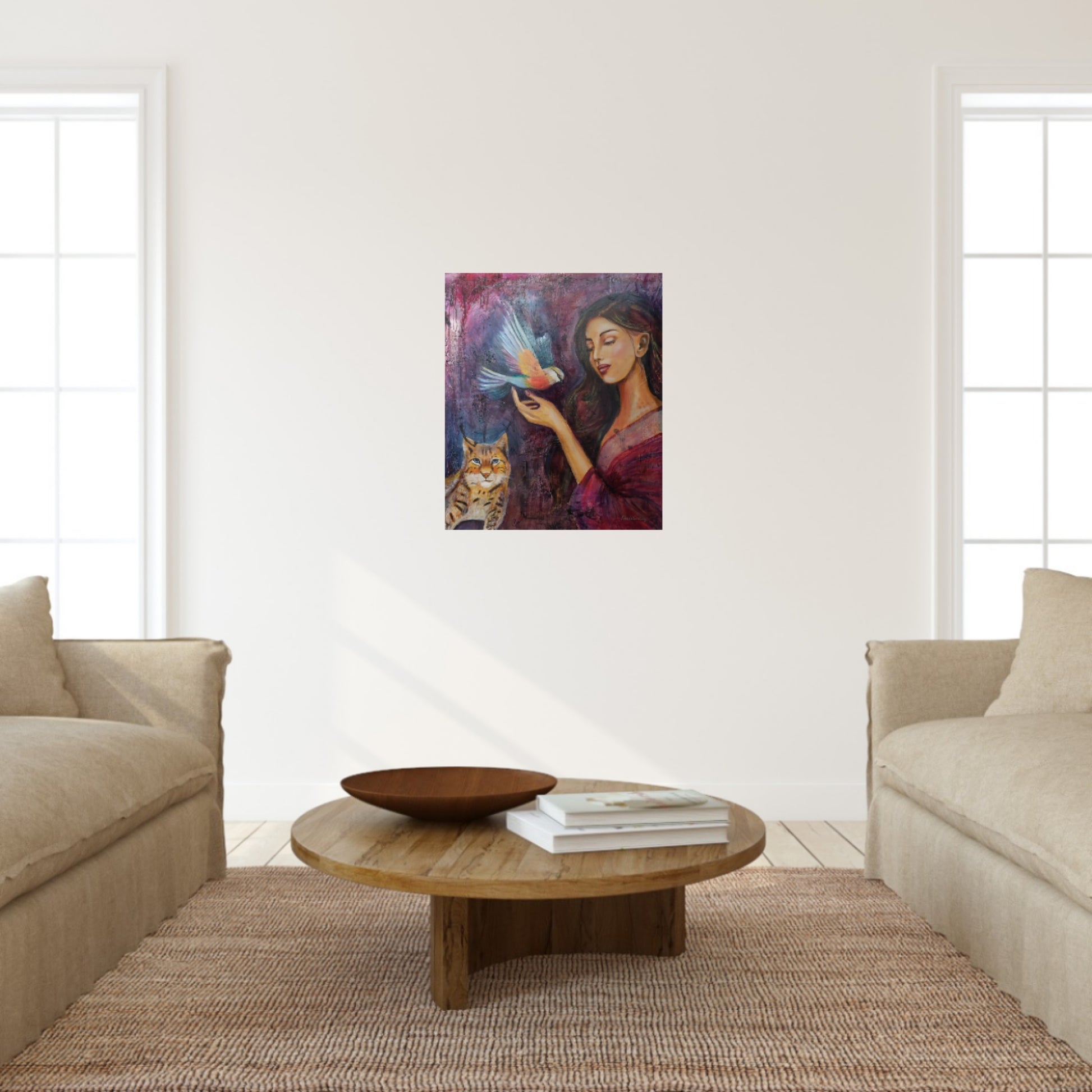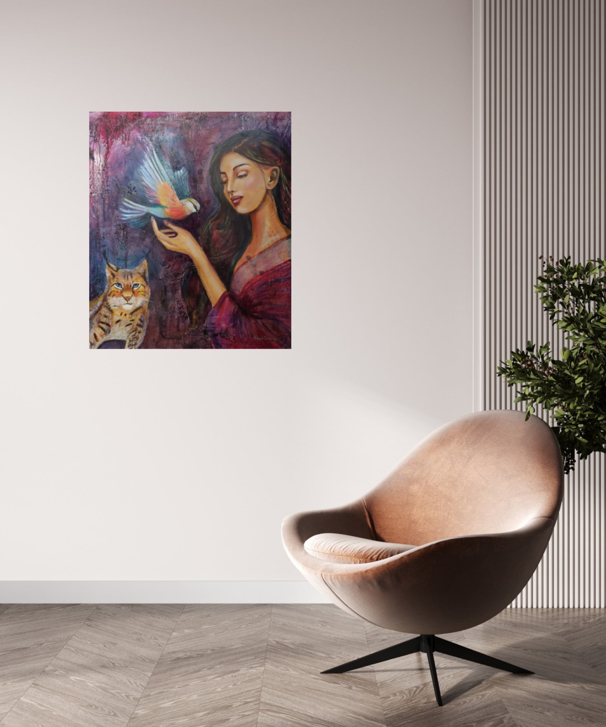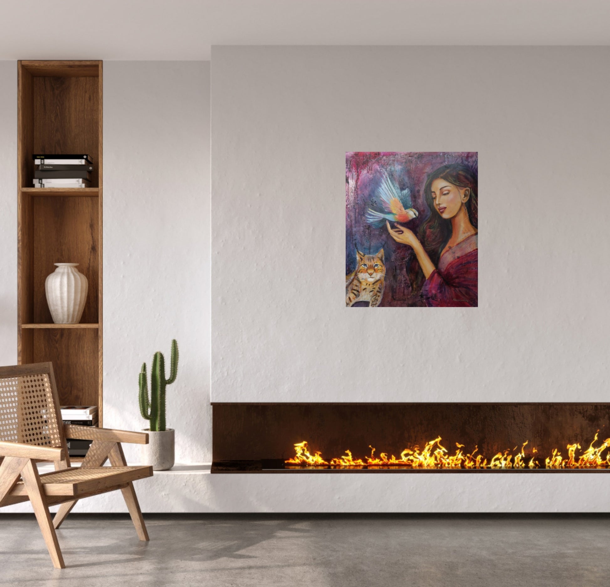 En mixmedia målning i olja. 60x70x3 cm canvas duk. Motiven målas över kanterna.